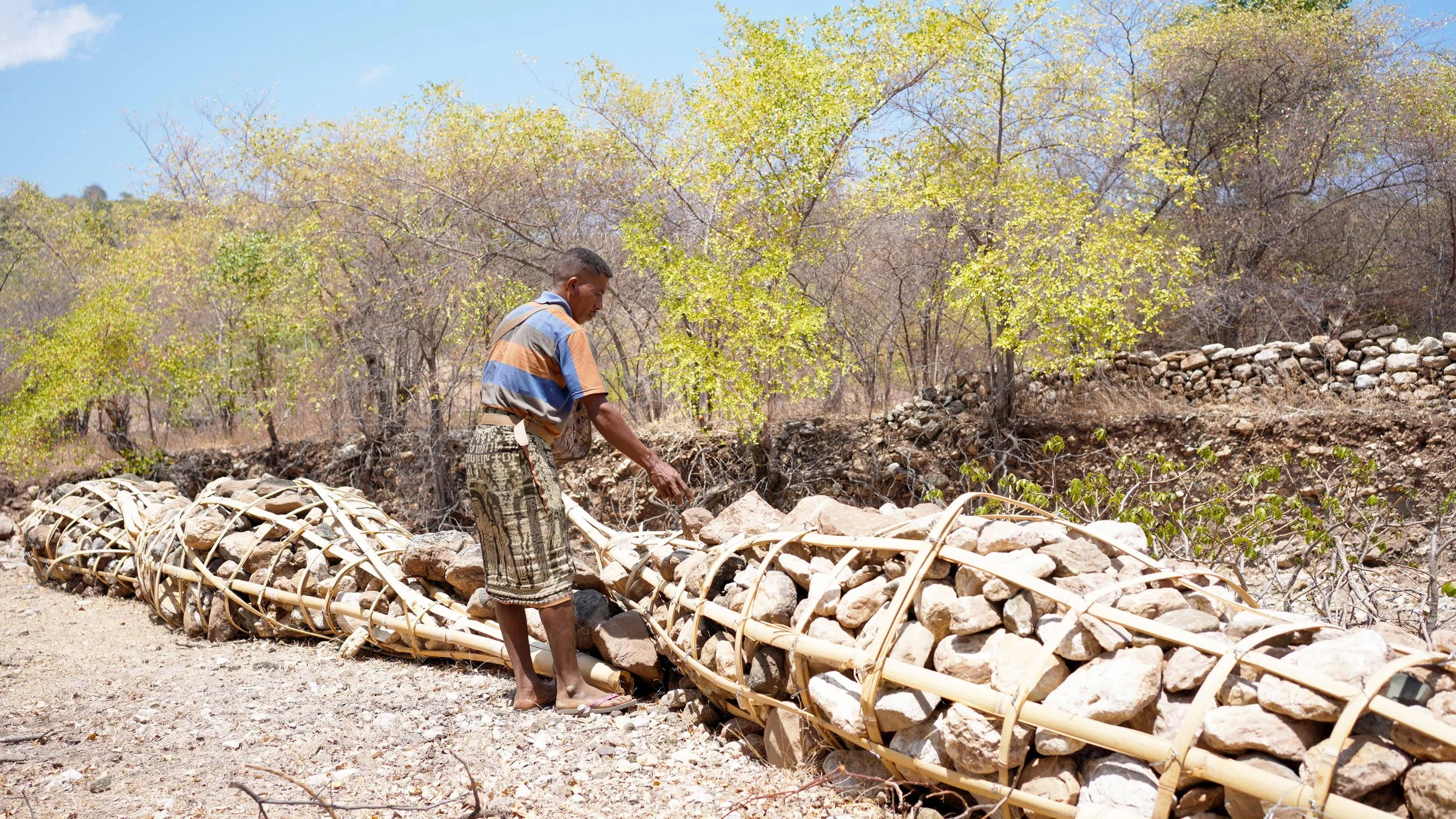 Agustinho demonstrates how the gabions work to redirect flood waters away from homes during the rainy season. IMAGE: Aderito do Rosario da Cunha Mambares