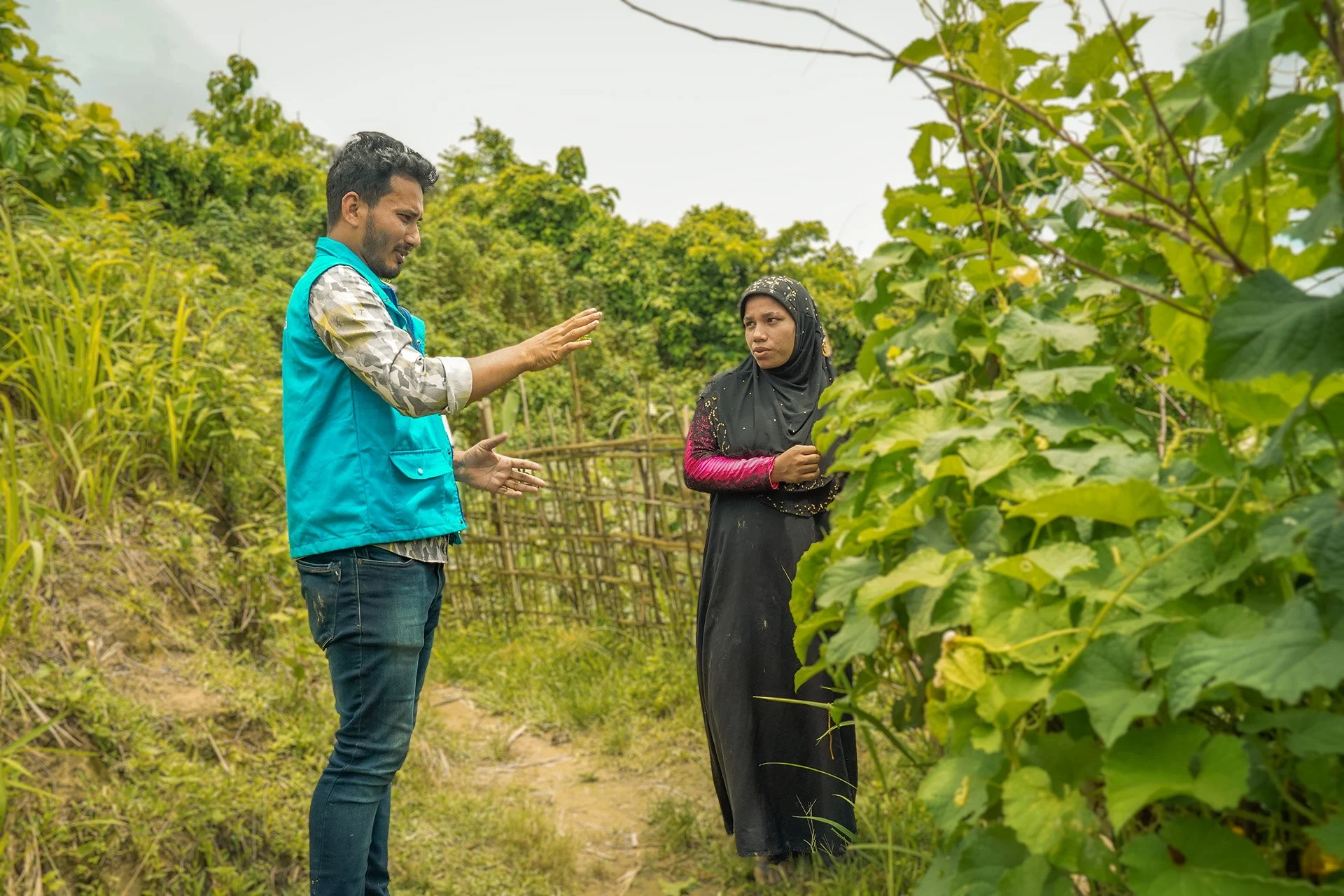 Above: 19-year-old Rajia speaks with a FIVDB volunteer, who helped her get her garden off the ground with support and training. Photo: Mahbub Alam/Plan International Bangladesh
